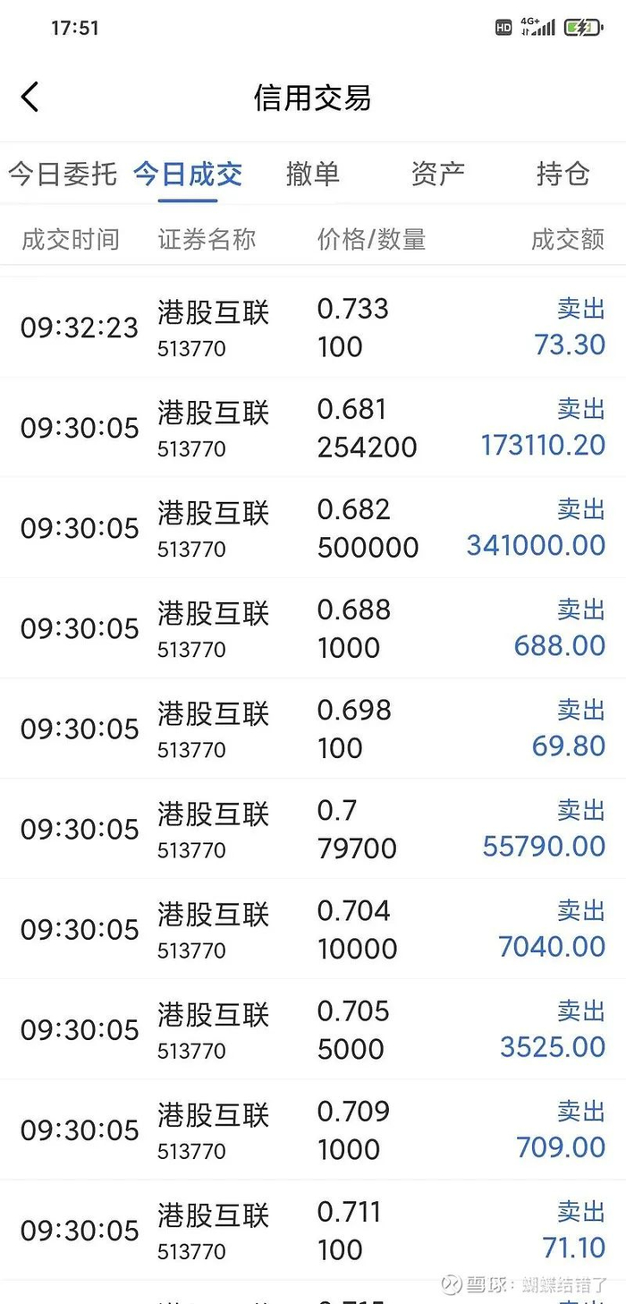 然后就发生了开盘的一幕,我这100万股卖单在开盘5秒钟之内瞬间击穿所有买单对手盘防线,我的最低成交价以0.681(-8.9%)成交。