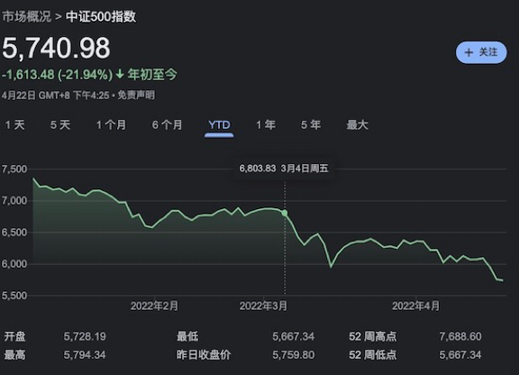 此外,中国股市连日走低,上证综指上周收于3086点,逼近3月部委喊话前的低点。代表成长股的中证500收于5740.98,今年以来的跌幅为21.94%。外资重仓股聚集的沪深300年初以来跌幅逼近20%。