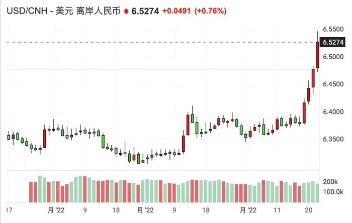 尽管这种跌幅比起在短短一个月暴跌10%的日元是小巫见大巫,但人民币今年以来的走势图平滑得像一条无波动的曲线,已经许久未出现过这种短期的暴跌,这不免令市场担忧,尤其是这一切恰逢国内多地疫情反复,且造成了较为严重的供应链中断。