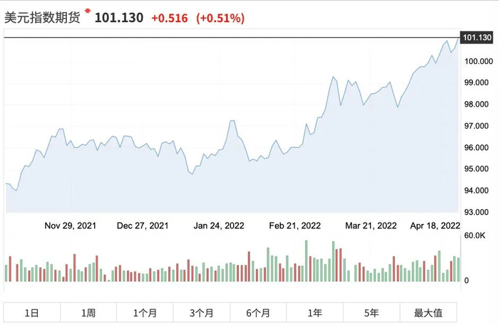 未来,美元的走势仍将成为影响人民币汇率的关键。两周前,美元指数突破100大关,4月22日收盘,美元指数突破101。尽管不断累积的财政赤字始终令各界对美元中长期看跌,但在强劲的紧缩预期下,短期动能不减。