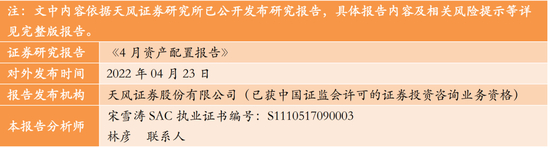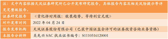 择时体系信号显示,均线距离为-9.97%,均线距离的绝对值突破3%的阈值,市场继续处于下行趋势,市场进入下行趋势格局,在我们的体系下,核心驱动变量为赚钱效应的度量。当前赚钱效应为-8.77%,长期下行趋势格局仍在延续。短期而言,即将进入美联储议息时间窗口,国内降准落地,降息落空,新一轮利好预期仍需等待,时间上进入一季报的集中披露期,市场风险偏好难以提升,整体而言,下行趋势仍将延续,等待新的利好刺激。长周期的行业配置上,根据分析师盈利预测展望2022年行业景气度的情况,利润增速靠前的行业为新能源动力系统以及旅游和农业和稀有金属;中周期天风量化two-beta中期行业选择模型信号数据显示,结合海内外情况,4月模型结论显示利率处于我们定义的上行阶段,经济处于我们定义的下行阶段,行业配置建议关注周期下游和消费;重点配置周期下游中的房地产、建筑、建材,消费中的养殖和旅游。在下行趋势中的反弹阶段重点关注景气度较高的电池30ETF(159757)。