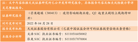 芒果超媒2021年实现营收153.56亿元,同比增长9.64%;归母净利润21.14亿元,同比增长6.65%;扣非后归母净利润为20.60亿元,同比增长11.57%。2022Q1公司实现营收31.24亿元,同比下降22.08%,归母净利润5.07亿元,同比下降34.39%,归母扣非后净利润4.74亿元,同比下降38.49%。22Q1由于疫情反复,内容生产进度受到影响,导致芒果重点综艺节目排播延后,同时去年同期基数较高,22Q1业绩同比下滑符合预期。