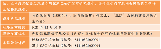 瑞智联、瑞智检、瑞影云是公司在智慧医院建设背景下分别针对生命信息支持业务、IVD业务、影像业务推出的智能化IT解决方案平台。截至2021年上半年,公司的瑞智联在国内已实现装机+签署订单共计76套,瑞影云在国内已实现装机+签署订单共计400套,同时开始在国内市场大力推广迈瑞医疗智检实验室IT方案。在国内智慧医院建设的发展浪潮下,“三瑞”系统有望打造新型院内诊疗生态圈,提升医院运营效率,应用前景广阔。