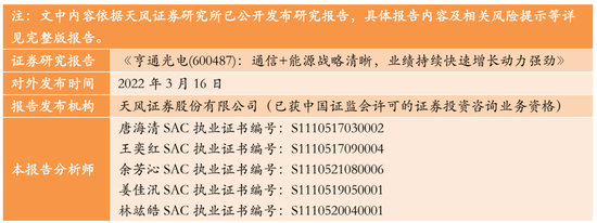 整体看,公司收入利润快速成长,通信+能源战略清晰。1)光通信进入景气周期,价格回升业绩弹性可观。2)公司作为海缆海工头部厂商之一,或将充分受益于海风行业快速发展,在手订单充裕,同时技术具备优势,享受高压缆良好竞争格局,整体业务成长性强。3)海洋通信业务未来或迎来海底光缆更替周期,收购华为海洋提升竞争力。4)国网大力推动特高压建设,公司向特高压市场拓展有望提升盈利能力。由于原材料价格影响,调整预计公司22-23年净利润为23亿、29亿(前值为25亿、31亿),对应22年10xPE,预计24年净利润35亿元,维持“买入”评级!