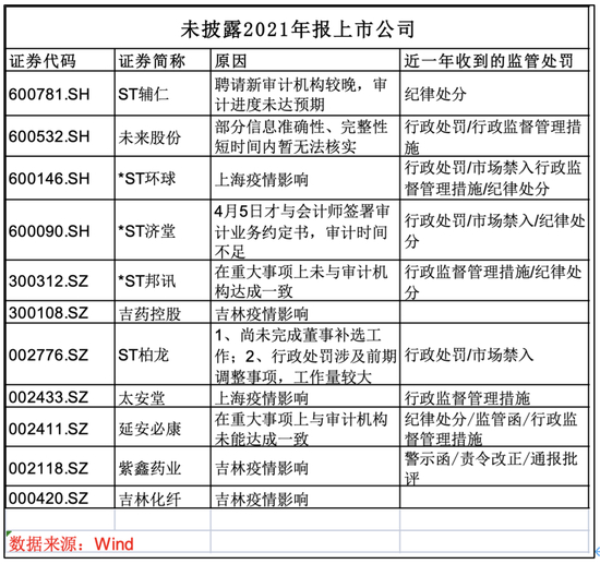 截至5月7日,依然有ST辅仁、*ST济堂、太安堂、延安必康、未来股份、*ST环球、*ST邦讯、吉药控股、ST柏龙、紫鑫药业、吉林化纤11家公司未能披露年报。