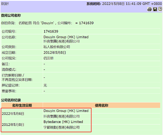 记者日前获悉,字节跳动已经悄然将2012年注册于香港的字节跳动(香港)有限公司更名为抖音集团(香港)有限公司。
