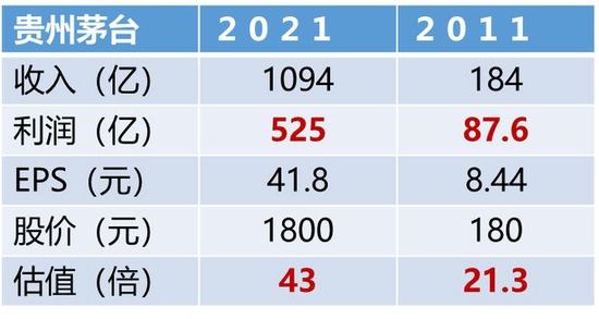 如果能找到被低估的成长股,除了享受内在价值的提升,还能享受估值回归带来的回报,也就是“戴维斯双击”,这个是最爽的事情。A股历史上也有非常多这样的例子。比如A股股王茅台。2011~2021年,茅台盈利增长500%,估值提升100%,股价涨了10倍,加上分红、送股的话涨了不止10倍。享受了利润的高速增长以及估值的提升,典型的“戴维斯双击”!