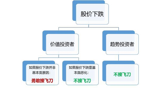 首先扪心自问,你是什么样的投资者。如果你是个趋势投资者,不要接飞刀,飞刀跟你没关系,飞刀太危险了,你觉得是底,底下还有负二层,负二层下面还有负十八层。如果你是价值投资者,可以接飞刀。但是接飞刀的前提是判断好股价下跌是否因为基本面的恶化。如果股价的下跌是因为恐慌、外部因素等非基本因素的恶化,不是因为实质性的因素,那就勇敢去接。但是如果股价下跌是因为内在价值的不断恶化导致的,那就不要去接。