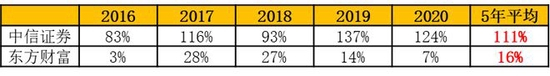 2020年7家传统券商的人均产出为171万元,东方财富为161万元(增长很快),人均产出相差不大。然而人均薪酬差异巨大,2020年7家传统券商的人均薪酬为83万,而东方财富仅为27万,仅为传统券商的32%。可以发现传统券商的人均薪酬非常高,东方财富人均薪酬就相对要低非常多。