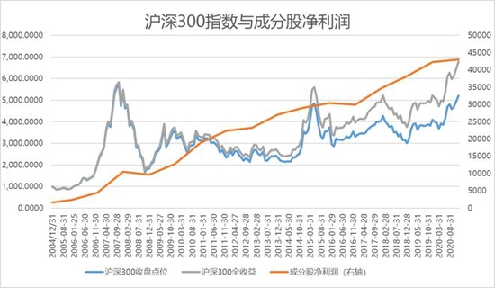 当中这条红线就是按照沪深300的10%~12%左右的利润的增长率画的趋势线(假设估值保持不变)。可以看到,市场经常会偏离利润增长的这条相对均衡合理的趋势线,既有往上的波动,也有往下的波动(当然往下波动的时间更长),大部分人会觉得持股体验不好。