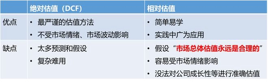 估值分为绝对估值和相对估值,绝对估值优点是严谨,理论上最可靠、最缜密,缺点是太多的假设对普通投资者来说太难用了,而且garbage in garbage out,即如果假设进去的时候不严谨,出来的结果也没什么意义。但是不管怎么说,DCF估值是最严谨的估值。相对估值比较简单,比如同行市盈率40倍,那我算算EPS,乘以40倍,得出股价。市场99%的投资者,包括专业的投资者、基金经理大多是用相对估值。