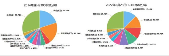 这是整个沪深300的整体表现,如果细看,也会发现沪深300结构是在不断进化的。2014年,正好是我离开券商、自己创办“益研究”的时候。那时候是个市场低点,估值也非常便宜。那时候的沪深300跟现在的沪深300,已经发生了翻天覆地的变化。