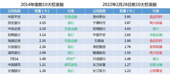 2014年指数以周期板块为主:银行、非银金融接近4成。现时点银行、非银金融占比大幅度下降,食品饮料从4%提升至12%、电力设备从忽略不计提升至10%、电子计算机从忽略不计提升至10%、医药生物从5%提升至8%。