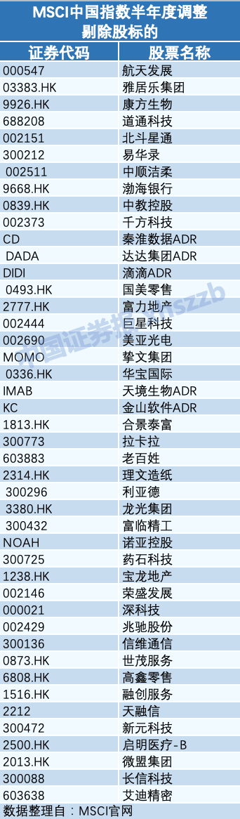 除新纳入股票之外,MSCI中国指数本次剔除了44只中国股票,其中包括21只A股。遭到剔除的股票有航天发展、雅居乐集团、康方生物、道通科技、北斗星通等。