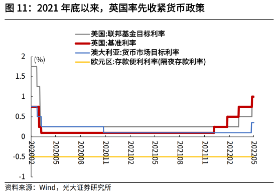 疫情后英国也迅速降息,并且率先在2021年底开始加息。3月,英国央行两次紧急降息,基准利率从0.75%骤降至0.1%的历史低位。而正如前文所分析,英国本轮疫苗接种和防疫管控放松节奏领先于其他国家,这给了英国更快退出强刺激的支撑,在2021年底,英国央行先于美联储,在2021年12月、2022年2月、2022年3月、2022年5月连续四次加息,将基准利率上调至1%。