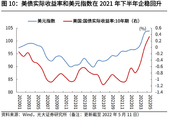 但是,美国也依赖财政和货币刺激,快速走出了疫情对于经济的冲击。2021年下半年,配合着拜登政府推动新一轮防疫政策放松,美国经济和就业持续恢复, 2021年下半年美联储开始释放加息信号、美债收益率持续抬升,美元指数再次企稳回升,并在俄乌局势的催化下,在2022年4月重回100关口。