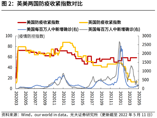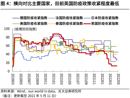 横向对比主要国家,目前英国防疫政策最松,基本完全解封。2022年2月24日,英国英格兰地区解除所有现行新冠限制措施。根据新的防疫政策,新冠检测阳性者将无需再自我隔离。从4月1日起,英国政府将不再为民众提供免费的新冠病毒检测。根据our world in data计算的防疫收紧指数来看,横向对比主要经济体,目前英国防疫政策收紧程度最低(见图4)。