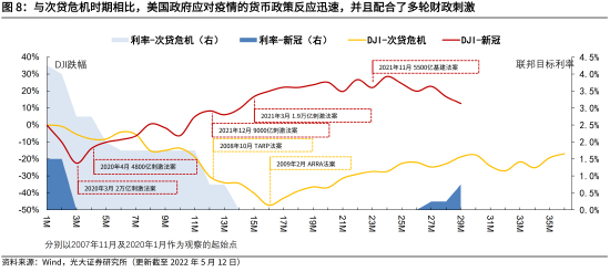 与次贷危机相比,新冠疫情冲击下,美国宏观经济对冲政策有三个特点。一是推出了更快更强的货币政策,美联储在2020年3月,14天内连续降息150bp,一次性消耗了降息的政策空间。二是货币政策与财政政策紧密配合,美联储大规模购入美国国债,以支撑前后通过了五轮共约6万亿的财政刺激计划。三是,美国政府通过财政刺激计划,以直接现金补贴、失业补贴、企业贷款等方式补贴给企业和居民2.9万亿美元,进而支撑消费和经济恢复。
