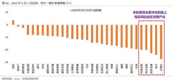 (2)可选消费品中,部分to C端消费品(如白酒、汽车、新能源车、电子等),由于本轮疫情风暴中心位于长三角中心城市上海,疫情的爆发对于长三角地区产业链和供应链形成了直接冲击,因此3月疫情爆发以来,计算机、电子、电力设备、机械等长三角关键产业股价出现一轮持续深跌。因此,当前交易复工复产逻辑,这些板块进入修复供应链的超跌反弹阶段,但是由于他们的需求端大部分与经济总体情况挂钩,因此后续还需要更多稳增长的手段把经济预期稳住。这一点与20年武汉疫情后不同,由于当时疫情前经济本就处于上行趋势,因此疫情后经济修复更快,耐用品消费业恢复更快。