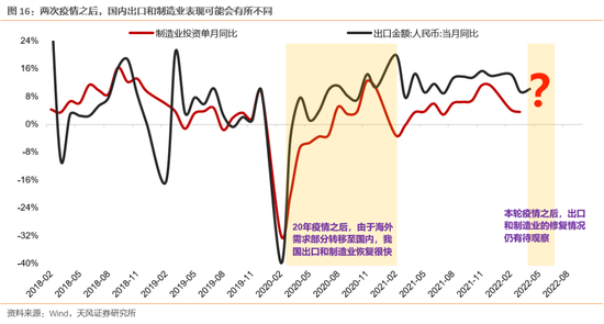 但是,考虑当前海外生产能力已基本恢复,同时,库存处于高位水平,消费需求在快速流动性收缩的情况下可能难以变得更好,因此,中国的出口和制造业已经出现一定疲态,这也决定了本轮疫情之后,可能很难再现20年疫后出口、制造业迅速修复的情形。