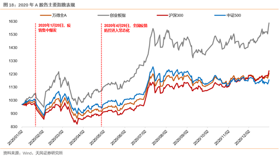 拉长时间线,从各主要指数2020年全年的表现也可以看到,市场最为动荡的阶段主要在2020年初,即疫情爆发初期、确诊病例呈指数级增长的阶段。但4月底武汉在院新冠患者清零、全国疫情防控进入常态化端后,市场表现基本企稳。疫情爆发6个月之后,市场已基本消化了年初疫情集中式爆发给市场带来的冲击,重新回归正收益区间。