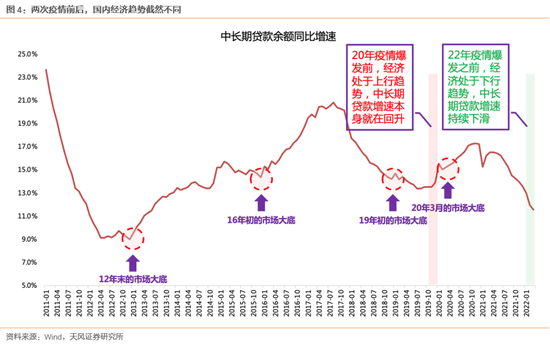 (2)中长期贷款增速:20年疫情之前,底部趋势回升;22年疫情之前,持续回落。