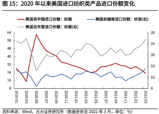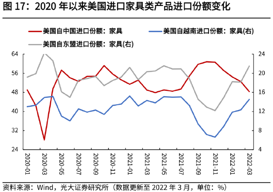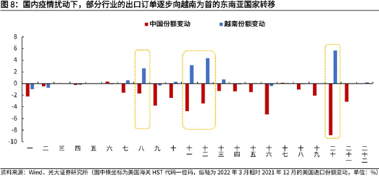 今年以来,由于国内供应链受到局部地区疫情的阶段性扰动,叠加东盟复工复产加快推进,以越南为代表的东南亚国家,在服装、家具等领域对我国出口形成明显替代,从美国进口数据来看,2021Q4至2022Q1期间,我国约有5%的纺织品、7%的家具品、2%的机电品订单份额转移到以越南为代表的东盟国家。