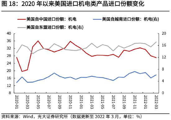 2022年3月份,受疫情短期扰动,我国机电产品占美进口份额为27%,较2021年9月下降4.1个百分点,估计2022年4月份额会继续回落至20%(参照2020年3月份情况)。同期,越南及东盟机电产品份额则较2021年9月分别上升0.8、2.1个百分点,存在部分出口份额的替代。