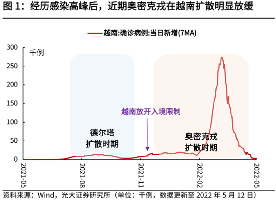 4月以来,在经历感染高峰后,奥密克戎在越南扩散明显放缓。4月30日,越南单日新增病例(7DMA)已由3月31日的13.8万例降至1.36万例,到5月11日,这一数字已降至3075例,越南疫情已出现明显缓和。叠加越南的防疫政策逐步放松,越南的工业生产逐步恢复正常。