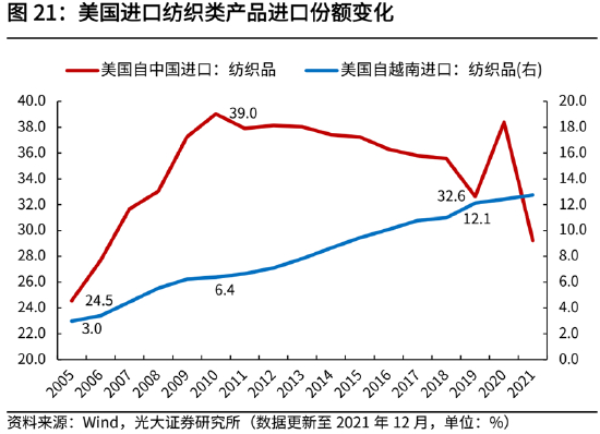 2010年起,我国服装纺织类企业向越南转移的效应逐步凸显。2010年之前,美国自中国进口的纺织类产品份额迅速上升,纺织品类(对应HST section 11)份额由2005年24.5%上升14.5个百分点至2010年的39.0%,而同期美国自越南进口的纺织类产品份额则变化不大,仅上升3.4个百分点至6.4%;2010年之后,纺织类行业从我国向越南转移的趋势逐渐显著,主要原因在于我国人力成本逐年上升,而越南的劳动力成本相对较低,造就了纺织产业越南方面的相对比较优势。