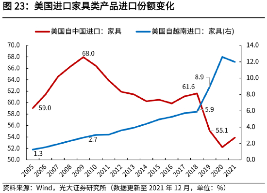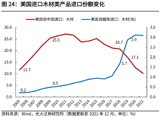 2020年至2022年间,由于疫情扰动,中国和越南木材及家居产品出口份额发生了替代效应,但从趋势来看,中国向越南转移木材产品份额的趋势仍然在持续。