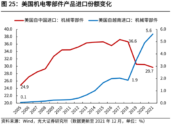 从美国进口数据来看,2018-2021年间,中国向越南转移的机电零部件产品份额约为4%,且趋势仍在持续中。2018年,美国自中国和越南进口的机电零部件产品(HST section 16)份额分别为36.6%和1.9%;到2021年,美国自中国和越南进口的机电零部件产品份额分别为29.7%和5.6%,中国减少6.9个百分点的份额,而越南则相应增加了3.7个百分点。