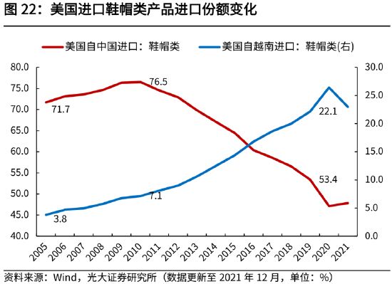 从美国进口数据来看,2010-2019年间,中国向越南转移的纺织类产品份额约为6%,鞋帽类产品份额更是达到15%左右。2010年,美国自中国进口的纺织类产品(HST section 11)和鞋帽类产品(HST section 12)的份额分别达39.0%和76.5%,而越南两类产品份额仅占6.4%和7.1%。2010年之后,我国纺织鞋帽类行业逐步向越南转移,到2019年,美国自中国进口的纺织类产品和鞋帽类产品的份额分别为32.6%和53.4%,分别减少6.4和23.1个百分点,而越南两类产品分别增加5.7和15个百分点,达到12.1%和22.1%。