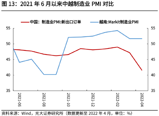 今年春节后,疫情缓和下,越南企业开始加速复工复产,并在3月中旬开放入境限制与防疫限制,而此时我国本土疫情多点多面散发,工业生产受到一定影响,部分之前回流到我国的订单,开始外流到越南。综合来看,两国之间出口订单存在较为明显的替代效应,并在疫情影响下呈现一定的替代轮动。