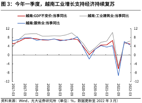 今年 3 月以来,越南的工业生产恢复加快。从越南统计局公布的数据来看,2022年 2-4 月,越南的工业生产保持相对较高景气,工业生产指数同比增速持续处于9%以上区间,已基本恢复到疫情之前的增速水平;从制造业景气水平来看,今年 1-4 月,越南制造业 PMI 也持续处于景气临界线以上。今年一季度,越南 GDP同比增长 5.03%,其中第二产业(工业和建筑业)增长 6.38%,是经济增长的核心推动因素。