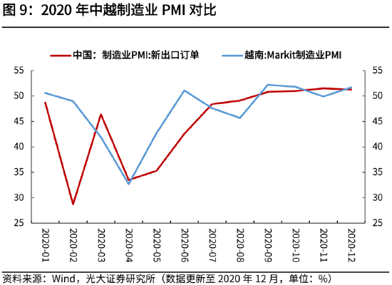 2020年二季度,美国财政刺激计划生效,耐用消费品进口需求增加。此时越南遭受疫情冲击,制造业PMI大幅低于荣枯线,新订单承接能力弱。同期,我国疫情形势明显好转,复工复产逐步推进,伴随一系列稳疫情、保增长政策出台,我国供应链持续修复,出口实现较快恢复。美国自中国进口份额由2020年2月的13.0%上升至2020年5月的22.7%,实现较快增长。