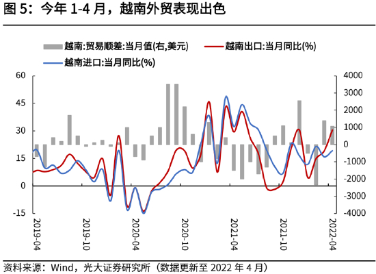 工业生产逐步恢复下,近期越南外贸表现亮眼。根据越南海关数据,2022年1-4月,越南出口累计同比增长16.45%,进口累计同比增长15.7%,在2021年上半年出口高基数情况下,越南外贸总体保持高景气态势,并高于疫情前增速。
