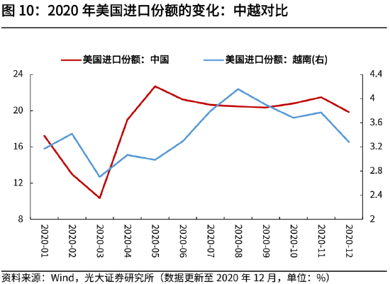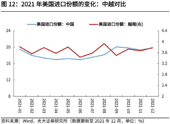 2020年下半年,越南疫情逐步好转,此时美国财政刺激效应延续,因而对中越两国进口份额均有提升。其中,中国的份额提升更为明显。2020年11月,美国自中国进口份额为21.5%,较2019年同期上升3个百分点。同一时段,越南则仅由2019年11月的2.8%上升至3.8%,上升了1个百分点。