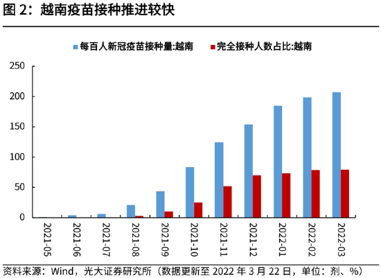 伴随疫苗接种覆盖率提升与疫情扩散逐步放缓,越南的疫情管控已大幅放松。越南的防疫放松始于2021年9月末,在经历德尔塔疫情扩散高峰后,越南逐步放开封锁措施,改变防疫策略,并于2021年11月启动新冠疫苗护照计划,放开入境限制,这也导致此后奥密克戎在越南的迅速蔓延。