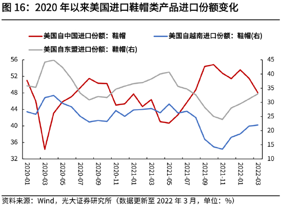 分类别来看,以越南为首的东南亚国家,主要承接我出口中的皮革品类(HST section8)、纺织品类(HST section11)、鞋帽品类(HST section12)以及家具品类(HST section20)。具体来看,2021年12月至2022年3月,美国自我国进口的上述四个品类的份额分别下滑1.7、4.7、3.4、8.8个百分点,而同期美国自越南进口这些品类的份额分别提升2.6、3.2、4.3、5.7个百分点。