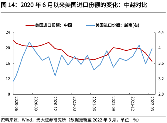 中越在出口表现上的差异与本轮疫情错位冲击有关,但出口份额的转移早已有之。对比2019年10月(疫情前)和2022年3月的美国对中越进口份额,我国由18.5%下降至16.5%,越南则由2.9%上升至4.0%,逐步实现了份额转移。
