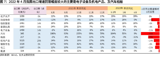 2022年4月,我国出口(以美元计)单月同比增3.9%,低于上月10.8个百分点。从环比来看,4月出口环比增速-1%,远低于历史同期7%的均值(2018、2019、2021年)。从分项来看,4月出口增速回落较大的品类,主要是电子设备、机电产品、及汽车船舶;消费品方面,服装和纺织品,出口同比增速分别为2%和1%,相对3月下滑9个和21个百分点。