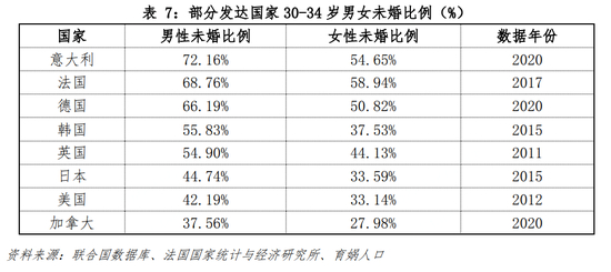 表 7:部分发达国家30-34岁男女未婚比例(%)