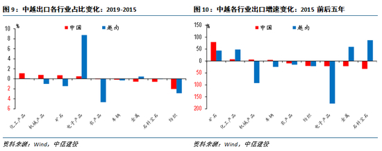 行业上,越南出口最大拉动并非服装,而是电子产品,国内则相对多元化,化工、机械、电子三足鼎立。