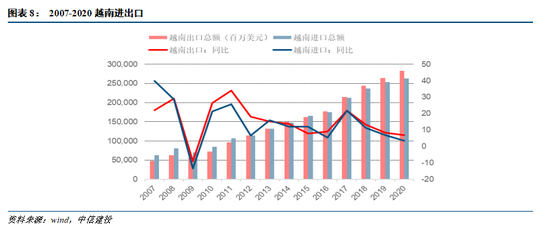 今年来,越南放开入境限制、国内供应链扰动,确实有利越南订单的承接。但是,越南在总量和结构,在产业链和供应链,很难对我国出口形成根本性的挑战,其电子产品和对美出口高增的现象,需要放到我国贸易结构调整的大背景下观察。