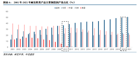 工业革命以来,以纺织服装为代表的劳动密集型行业经历五次迁移。(1)19世纪下半叶到20世纪初,第一次工业革命,纺纱机、蒸汽机等发明促使英国成为世界制造业中心。随后第一次工业革命传入欧洲大陆,德国开始取代英国成为世界制造中心。(2)20世纪30年代至50年代,第二次工业革命在美国兴起,美国取代德国成为全球制造中心,随着二战结束,部分劳动密集型产业向日本、德国转移。(3)20世纪50-70年代,日本快速发展,经济修复;在70年代末,纺织等加工行业转移向人力资源丰富,成本低廉的亚洲四小龙地区转移。(4)20世纪70-90年代,亚洲四小龙承接产业转移之后,经济腾飞;90年代末,低端制造业向发展中国家(主要是中国)转移。(5)20世纪90年代至21世纪初(金融危机之后),随着中国改革开放,经济发展,人力成本上升,劳动密集型行业再次发生转移;2010年,越南取代中国,成为耐克全球最大生产国,标志着第5次转移初步形成。