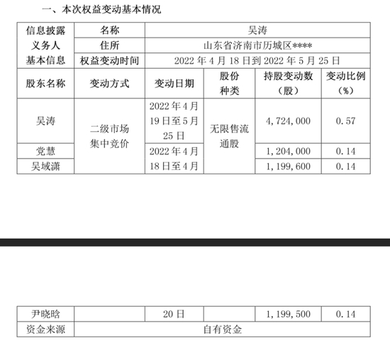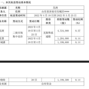 公告显示,公司持股5%以上股东吴涛及其一致行动人自2022年4月18日至2022年5月25日期间,通过集中竞价方式累计增持832.71万股,占公司总股本的1%。