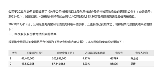 据淘宝网司法拍卖平台相关信息显示,经过多轮竞价,最终陈士皓在72轮角逐后,以2.559元/股的价格获得4.97%股权;吴涛经过14轮角逐以2元/股的价格获得5.23%股权并形成举牌。