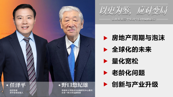 4月27日,日本著名经济学家、《失去的三十年》作者、前大藏省官员、一桥大学名誉教授野口悠纪雄老师,以及著名经济学家、宏观经济与房地产和人口领域专家任泽平老师,一起开启这场以史为鉴,应对变局的中日对话。