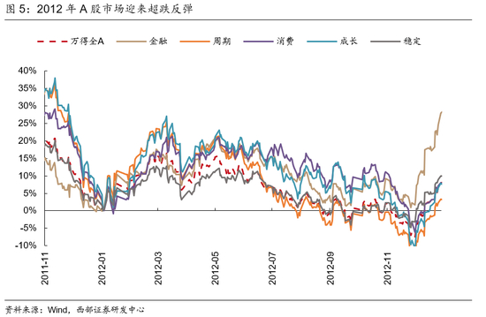 疲弱的基本面叠加外部冲击再度推动市场下行。5月初,随着市场进入业绩真空期叠加5月欧债危机爆发,市场风险偏好下降,A股市场再度步入调整期。到了2012年四季度,伴随降准降息与基建政策落地、地产政策微调,经济也出现复苏迹象,市场迎来反转。A股于同年12月3日再度见底,这一轮调整持续了144个交易日,5月7日至12月3日期间万得全A累计下跌19.96%,超过了反弹期间涨幅。